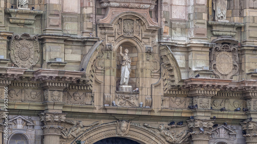 Statue on The Basilica Cathedral of Lima is a Roman Catholic cathedral located in the Plaza Mayor timelapse hyperlapse in Lima, Peru