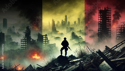 A lone soldier surveys a city in ruins, with the Belgium flag faintly overlaying the scene, representing the courage and determination of forces in times of war.