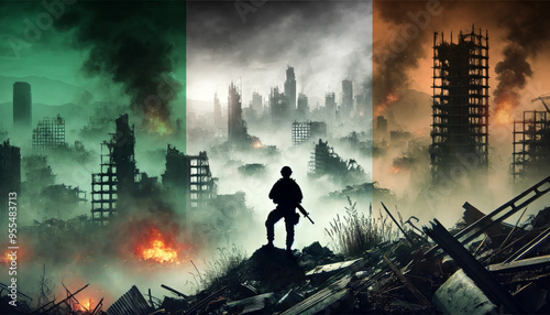 A lone soldier surveys a city in ruins, with the Irish flag faintly overlaying the scene, representing the courage and determination of forces in times of war.