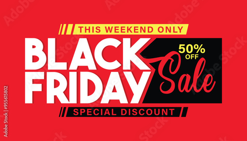 Black Friday sale banner, template, poster, flyer, greeting card. Up to 50% discount for black Friday holiday. Business promotion layout. Modern typography poster design on red background.