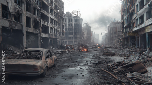 Scena zniszczonego miasta po apokalipsie, gdzie spalone pojazdy leżą na zrujnowanych ulicach, a budynki są w stanie ruiny.