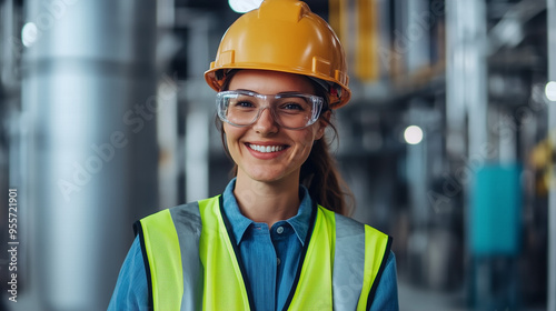 Uśmiechnięta inżynierka na placu budowy, nosząca kask ochronny, kamizelkę odblaskową i sprzęt ochrony osobistej.