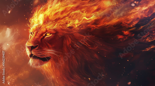 Portret lwa z ognistym futrem, który emanuje ciepłem i mocą. Jego wygląd jest pełen dynamicznych odcieni i płomiennych akcentów, tworząc dramatyczny i ekscytujący obraz.