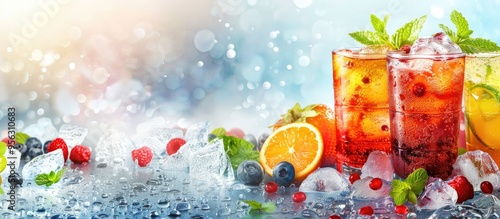 Refreshing chilled beverages like icy cold drinks and fresh juicy juices perfect for hot summer days with copy space image
