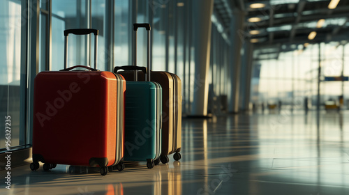 Różne walizki na tle nowoczesnego lotniska, podkreślające koncepcję podróży i logistyki.