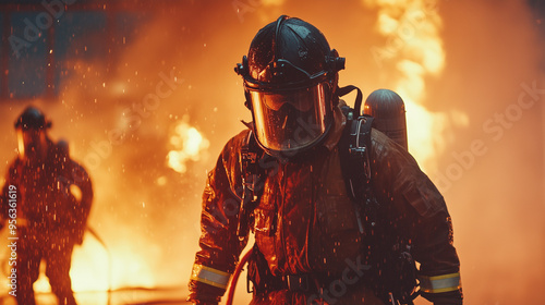 Strażacy w pełnym wyposażeniu używają wody i gaśnicy do tłumienia ognia podczas ćwiczeń.