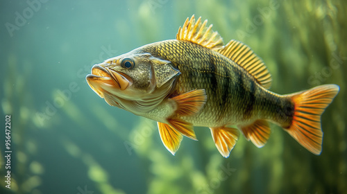 Duży okoń w wodzie, na tle zielonego otoczenia, stanowiący znakomite trofeum rybackie.
