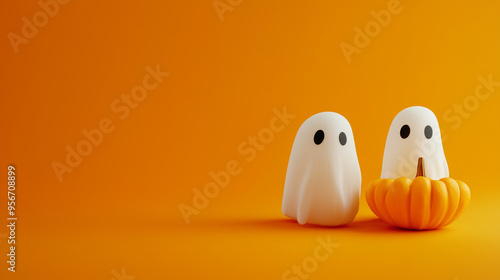 Zabawne duchy w towarzystwie uśmiechniętej dyni na jaskrawym pomarańczowym tle. Idealne na świąteczne dekoracje i kartki z życzeniami z okazji Halloween.