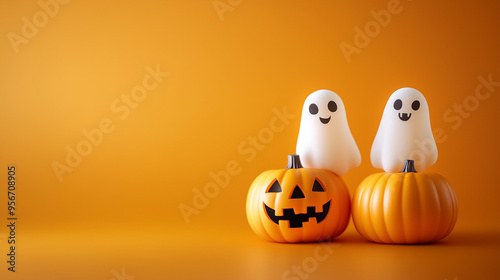 Zabawne duchy w towarzystwie uśmiechniętej dyni na jaskrawym pomarańczowym tle. Idealne na świąteczne dekoracje i kartki z życzeniami z okazji Halloween.