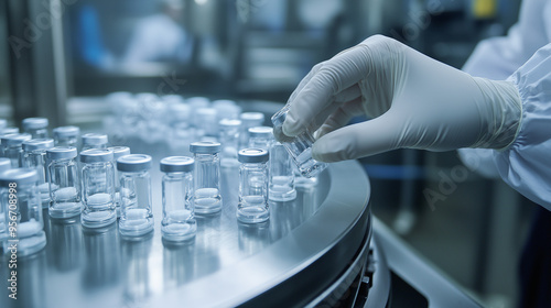 W rękawiczkach sanitarnych, pracownik inspekcji kontroluje medyczne fiolki na linii produkcyjnej w zakładzie farmaceutycznym.