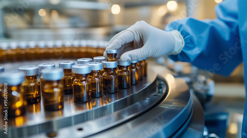 W rękawiczkach sanitarnych, pracownik inspekcji kontroluje medyczne fiolki na linii produkcyjnej w zakładzie farmaceutycznym.