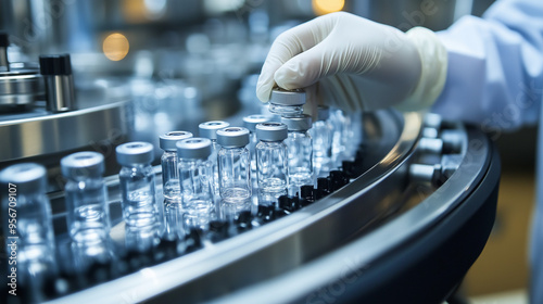 W rękawiczkach sanitarnych, pracownik inspekcji kontroluje medyczne fiolki na linii produkcyjnej w zakładzie farmaceutycznym.