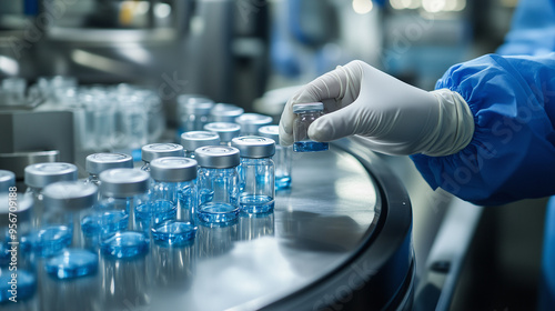 W rękawiczkach sanitarnych, pracownik inspekcji kontroluje medyczne fiolki na linii produkcyjnej w zakładzie farmaceutycznym.