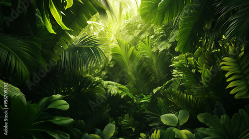 Wspaniałe, zielone liście i roślinność tropikalnej dżungli oferują intensywny widok na bujną florę.