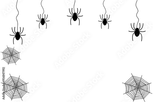 Spiders and webs in black color on white background . Blank space for text . Invitation, Halloween card