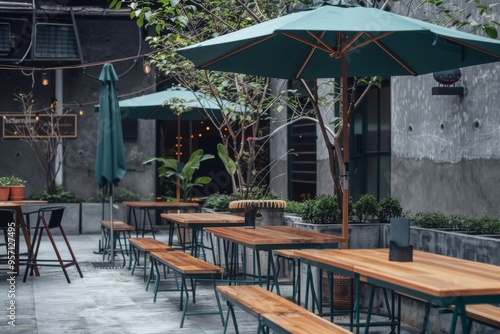 #1149531728Discover a wooden cafe in the heart of a forest, where rustic charm meets serene surroundings