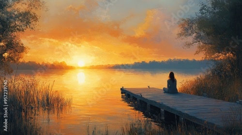 Oil painting depicting a serene lifestyle featuring a woman sitting on a dock during a sunset over a tranquil body of water