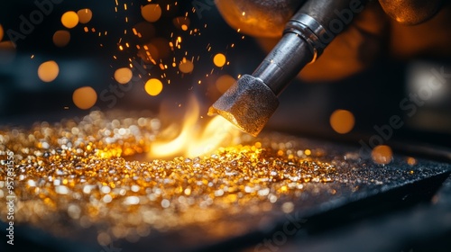 Goldsmiths use torches to melt small pieces of gold with intense flames and glowing metal in a controlled environment. The image highlights the precision and care taken in the gold refining process.