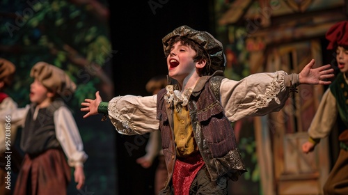 Highly detailed photograph of a boy participating in a school play, dressed in costume and acting on stage