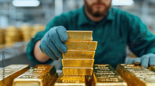 Hardworking Refinery Employee Stacking Gold Bars with Industrial Machinery in Realistic Setting - Selective Focus and Copy Space
