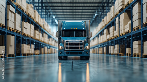 Nowoczesna ciężarówka pełna paczek, stojąca w magazynowej zatoczce, przygotowana do dalszej dystrybucji.