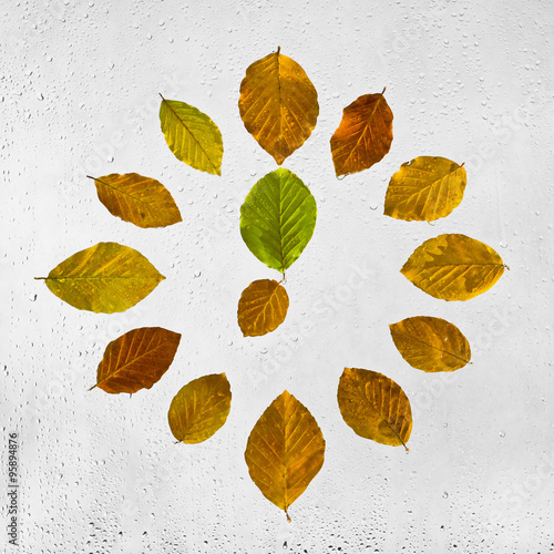 Zegar ułożony z kolorowych jesiennych bukowych liści na mokrej szybie. Godzina siódma. Kolorowe podświetlone mokre jesienne liście przyklejone kroplami deszczu do okna na szarym tle.