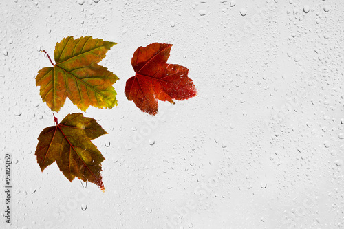 Kolorowe jesienne liście klonu i krople deszczu na oknie. Kolorowe podświetlone mokre jesienne liście przyklejone kroplami wody do okna na szarym tle.