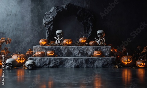 A Halloween scene with skeletons, pumpkins and a cave backdrop.