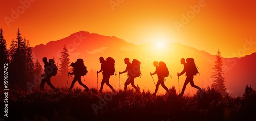 Silhouettes of hikers walking through a mountain pass at sunset.