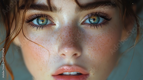 Close-up portrait of a young woman with freckles and green eyes.