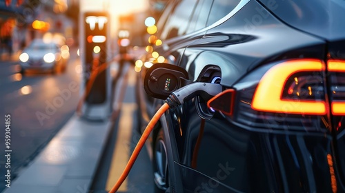 Electric car charging at a station, sleek and modern, Urban, Cool tones, Photograph, Sustainable transport