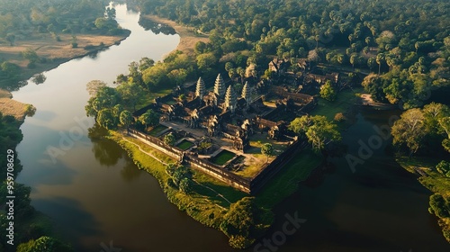 Aerial perspective of the Angkor Wat complex, with its grand moat, temple structures, and surrounding forest.