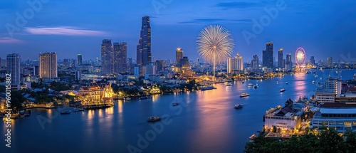 Nighttime view of Bangkok skyline with fireworks and river