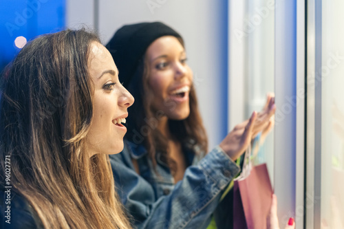 Two women friends in the evening just after sunset are doing shopping in around the city. They stopped in front of a shop window that illuminates their faces. One of them looks aghast article