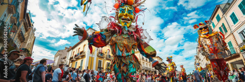 Participants in imaginative, extravagant costumes lead the parade, accompanied by giant puppet floats, making it a vibrant and festive outdoor celebration full of energy, unusualness explosion, banner