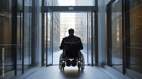 A business professional in a motorized wheelchair entering a modern office building navigating through automatic doors