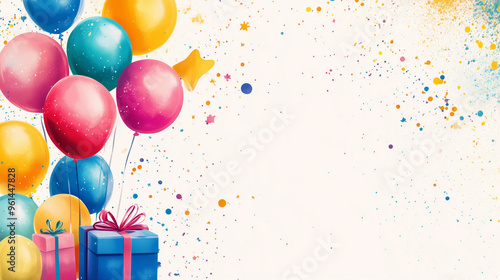 Wizualizacja urodzinowa dla dziecka, na której kolorowe balony i piękne prezenty tworzą przyjazny i radosny wygląd.