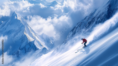 Narciarz pochylony w stronę stoku podczas szybkiego zjazdu w wysokich górach, z ośnieżonymi szczytami w tle.