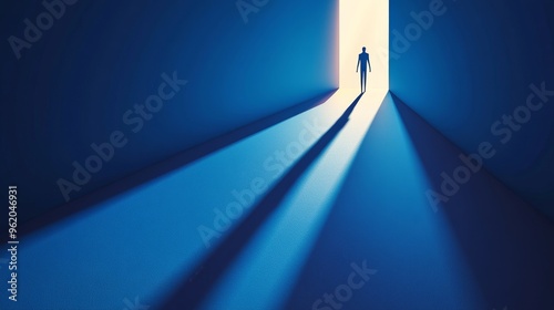 A silhouette stands at the threshold of a doorway, casting long shadows in a serene blue environment, symbolizing hope and change.