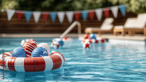 Colorful pool toys and decorations create festive atmosphere in swimming pool. vibrant red, white, and blue colors enhance summer vibe.