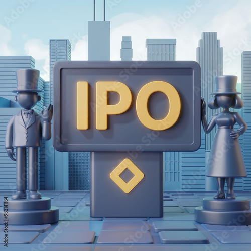 3D render of a stock market with a large screen displaying the acronym "IPO". The screen is flanked by two statues of a man witha top hat and a woman with a dress