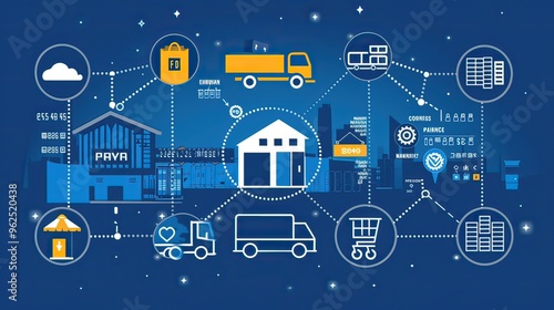 A flowchart diagram illustrating the various stages of supply chain management, with icons representing suppliers, manufacturers, distributors, and retailers.