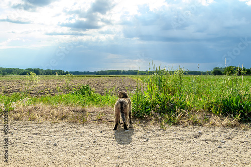 Krajobraz wiejski z kotem, dziki bury kot podziwiający piękny świat