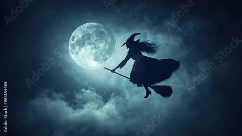 Witch flying on a broomstick over a full moon, silhouetted against the night sky.