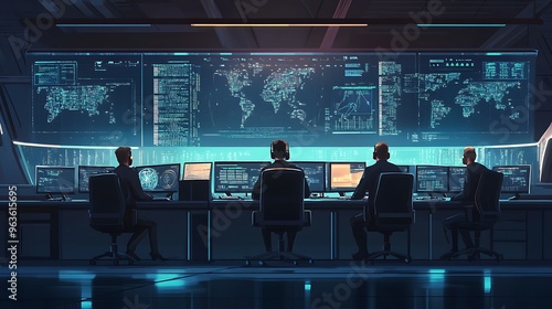 Cybersecurity Team Working Late in a Modern Office with World Map and Data Displays