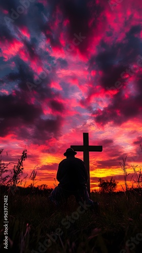 Silhouetted Man Praying Before a Cross at Sunset