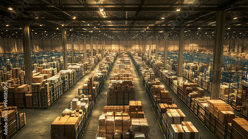 Rozległe wnętrze magazynu z uporządkowanymi regałami, na których znajdują się setki pudełek. Regały są rozmieszczone w równych rzędach, co ułatwia kontrolę stanów magazynowych .