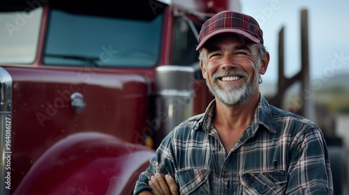 Kierowca ciężarówki w średnim wieku, który z uśmiechem stoi obok swojego pojazdu. W tle widoczny jest amerykański krajobraz, a truck wydaje się być w doskonałym stanie.