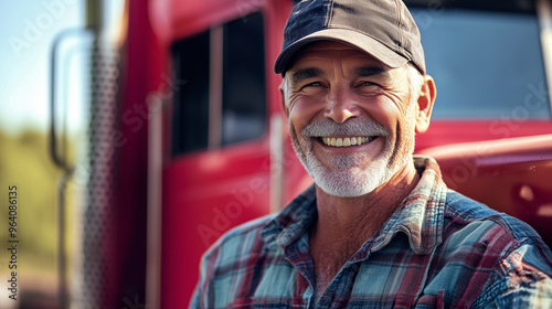 Kierowca ciężarówki w średnim wieku, który z uśmiechem stoi obok swojego pojazdu. W tle widoczny jest amerykański krajobraz, a truck wydaje się być w doskonałym stanie.