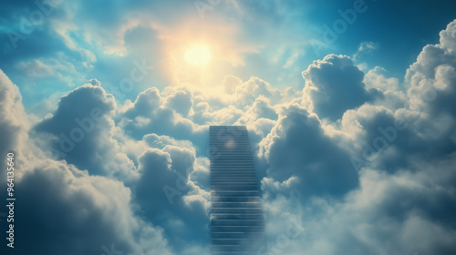 Schody wznoszące się ponad chmury, które prowadzą do promieniującego, niebiańskiego światła. Scena oddaje uczucie wznoszenia się do wyższego wymiaru lub duchowego celu.